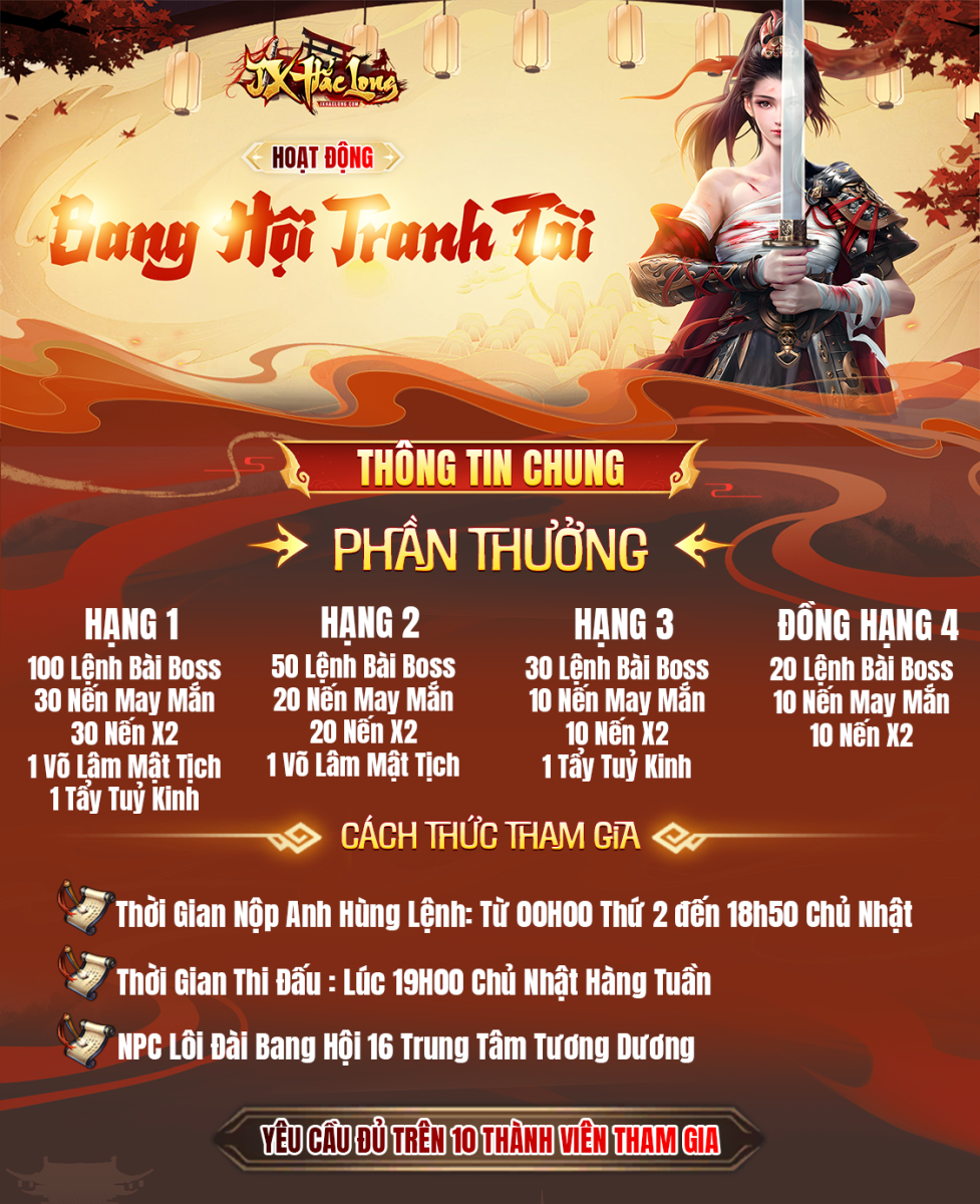 • Thể lệ thi đấu : Bang Hội Tinh Anh , Sau khi các bang hội nộp đủ 100 Anh Hùng Lệnh sẽ đủ tư cách tham gia giải